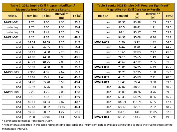 - Broader intercepts included: MW21-004: 1.67 grams per tonne (“g/t”) gold (“Au”) and 0.22% copper (“Cu”) over 34.92 metres (“m”); MW21-007: 1.84 g/t Au and 0.20% Cu over 39.54 m; MW21-008: 1.63 g/t Au and 0.46% Cu over 42.77 m and MW21-013: 1.22 g/t Au and 0.39% Cu over 51.06 m.