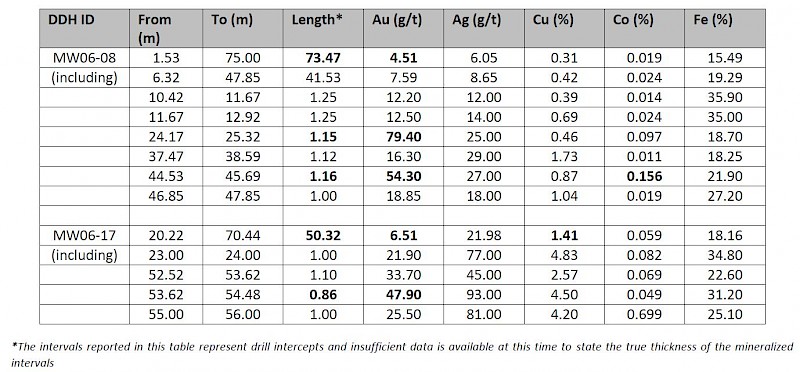 - Significant previous drill intercepts including 2006 drillhole MW06-17 which returned 6.51 g/t gold and 1.41% copper over 50.32 m 1 (see Table 1).