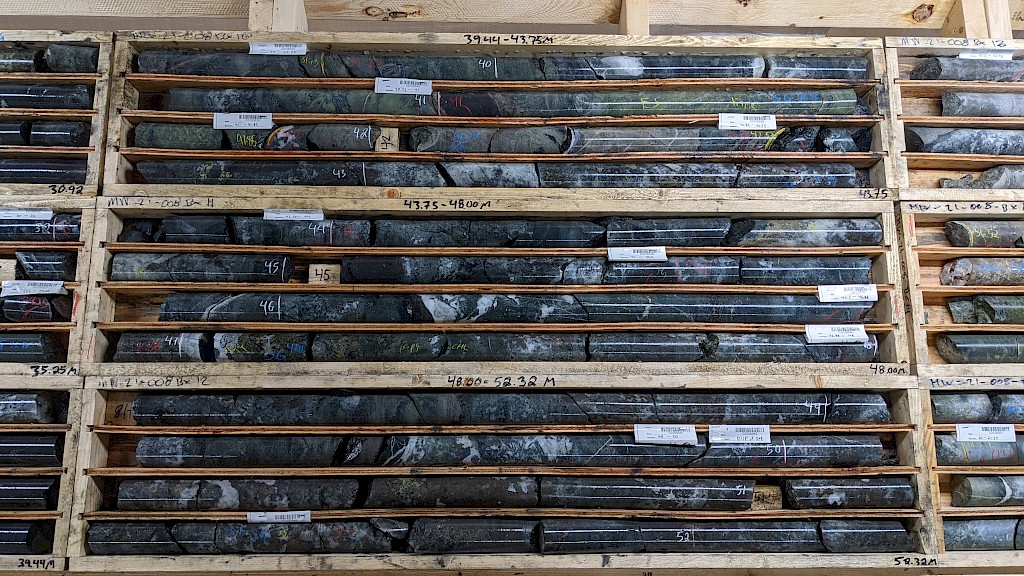 MW21-016. Photo of core box 64-66 (269.19-273.0 m). Part of reported intercept from 266.96 m to 279.0 m (12.04 m interval) of 0.55 g/t Au, 1.06% Cu, 12.2g/t Ag and 0.007%g/t Co. Including 272.25 m to 273.91 m (1.66 m interval) of 1.43 g/t Au, 4.38% Cu, 60.2 g/t Ag and 0.026% Co.